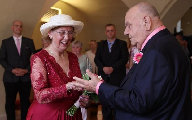 Ženich měl na sobě nový oblek, nevěsta červené šaty. Obřad se konal na Staroměstské radnici v Praze.