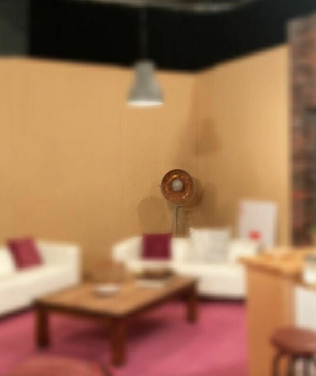Hnízdečko lásky bude obývací pokoj s meruňkovými stěnami, šedý kovový lustr, dvě bílé pohovky s bordó polštáři, jednoduchý dřevěný konferenční stolek a dekorativní kovová lampa s kruhovým stínidlem.