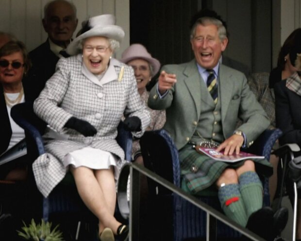 A zde se členové královské rodiny bezstarostně a upřímně smějí během královského setkání Braemar Highland ve Skotsku, kde se tradičně konají soutěže jako hod lanem, hod kladivem a další.