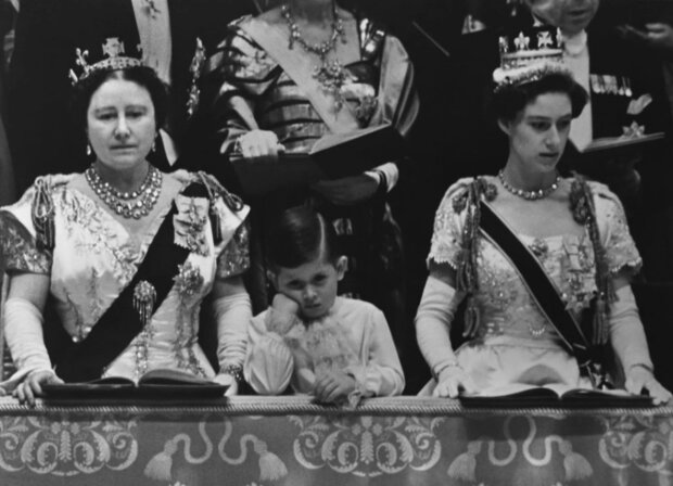 Princ Charles se svou tetou, princeznou Margaret (vpravo) a babičkou, královnou matkou Alžbětou, na korunovaci Alžběty II. v roce 1953.