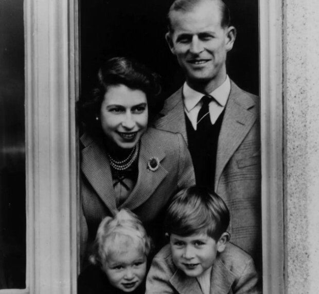 Všechna okna jsou stejná. Teprve nyní v něm pózuje Alžběta II. s princem Philipem, vévodou z Edinburghu, a dětmi Charlesem a Annou.