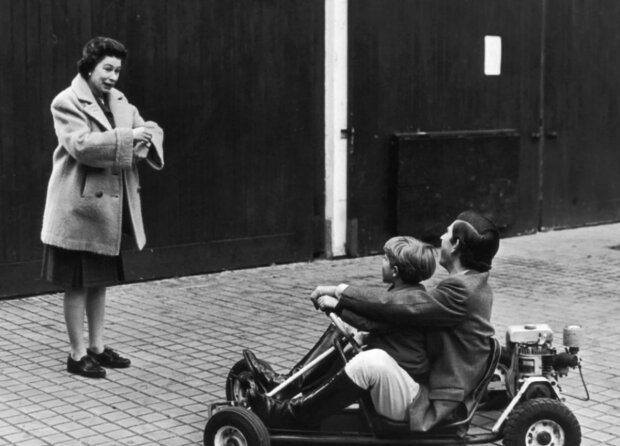 Charles jezdí na motokáře se svým mladším bratrem, princem Edwardem, a královna je nadšeně pozoruje.