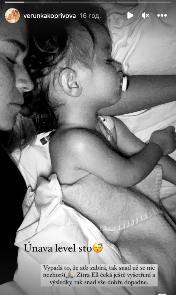 "Únava level sto. Vypadá to, že atb zabírá, tak snad se už nic nezhorší. Zítra Ell čeká ještě vyšetření a výsledky, tak snad vše dobře dopadne," informuje modelka.
