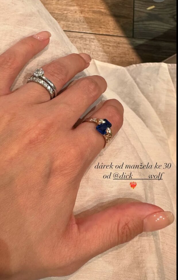 Svým fanouškům ukázala fotku luxusního zlatého prstenu s modrým kamenem od české designové značky Dick Wolf a připojila k němu jednoduchý, ale výmluvný popisek: