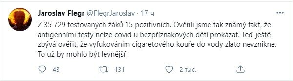 Parazitolog a evoluční biolog Jaroslav Flegr ověřil, že u bezpříznakových dětí nelze prokázat covid antigenními testy, jelikož z 35 729 testovaných žáků bylo pouze 15 pozitivních.