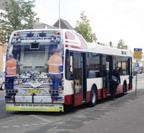 Sociální reklama z Nizozemska. Nápis na autobuse říká: “Nedělejte z autobusu popelářský vůz”. To je správná reklama. V napiš končinách by také přišla vhod.