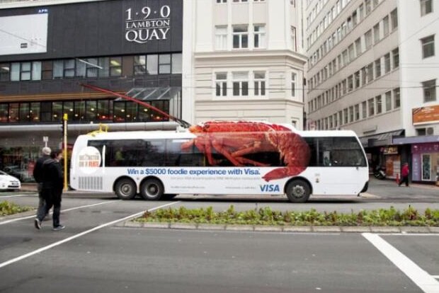 Na trolejbuse je napsáno: “Vyhraj s kartou VISA 5000 dolarů na dovolenou pro gurmány.” Zvlášť originální je vedení trolejbusu.