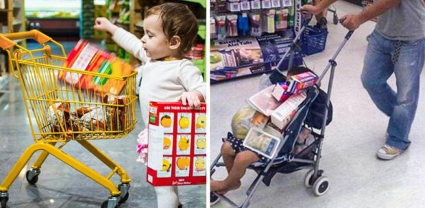Na další fotografii vidíme proces rodinného nakupování: máma učí svého syna, jak nakupovat, a táta nikdy, protože musí zjistit, kde všechno leží.