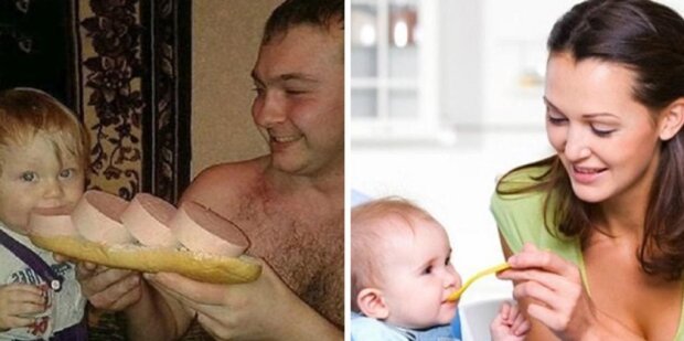 Zatímco matka učí dítě, aby se při jídle chovalo správně, otec si klade za cíl uspokojit jeho hlad co nejdříve. Hlavní věc je, že v obou případech dítě nebude hladové!