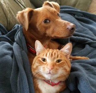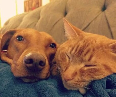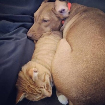 Kočička Kelvin a pes Joule se objímají a dřímají, zatímco lidé nejsou doma