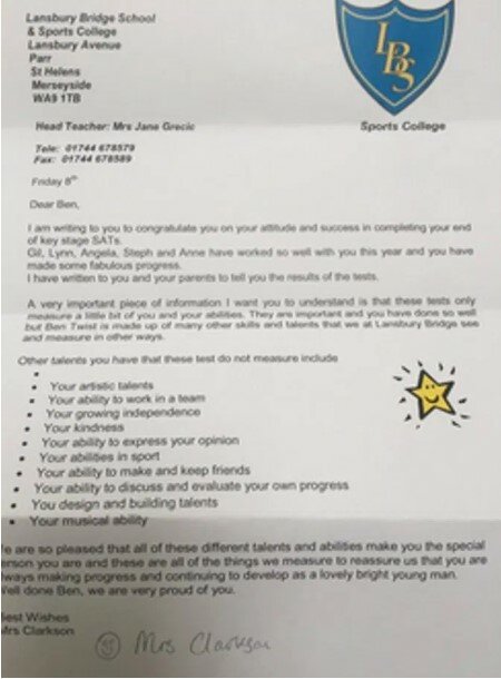 Jedenáctiletý Ben Twist psal testy SATs, jejichž úkolem je zhodnotit dovednosti v psaní, počítání a čtení s porozuměním. Chlapec bohužel neuspěl, i když se velmi snažil. V souvislosti s tím dostal dopis od Ruth Clarkson, své učitelky ze školy Lansbury Bridge School & Sports College.