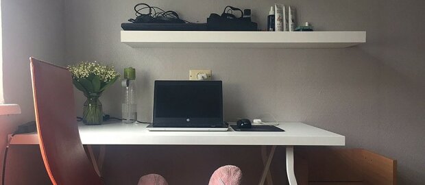 V IKEA jsem si koupila stůl a police. Naštěstí mám staršího bratra, který zavěsil police a pomohl uspořádat nábytek. Při vstupu do místnosti v rohu stojí postel-prostor pro spaní, pak skříň.
