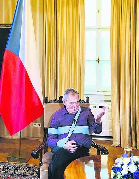 Na fotce z rozhovoru pro televizi Prima má pravou ruku fixovanou ortézou