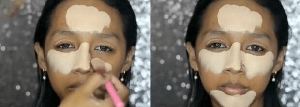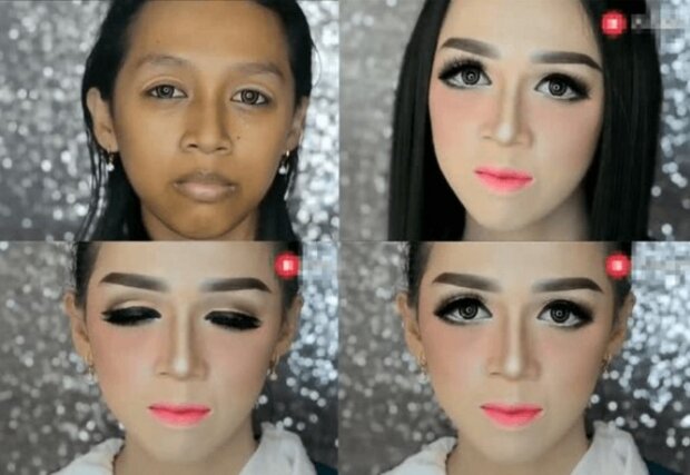 Aplikovala ruměnec a nalepila falešné řasy a nakonec nanesla růžovou rtěnku. Dívka se tak proměnila k nepoznání.