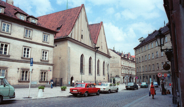Pohled na Pařížskou ulici z věže Staroměstské radnice. Jasné barvy automobilů a velmi mladé stromy jsou nápadné: