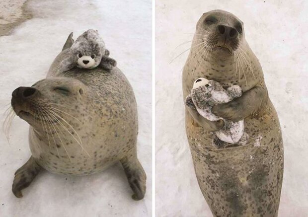 Když pečeť v Japonsku dostala mini verze sebe sama, objala hračku blízko srdce a dala jí na záda