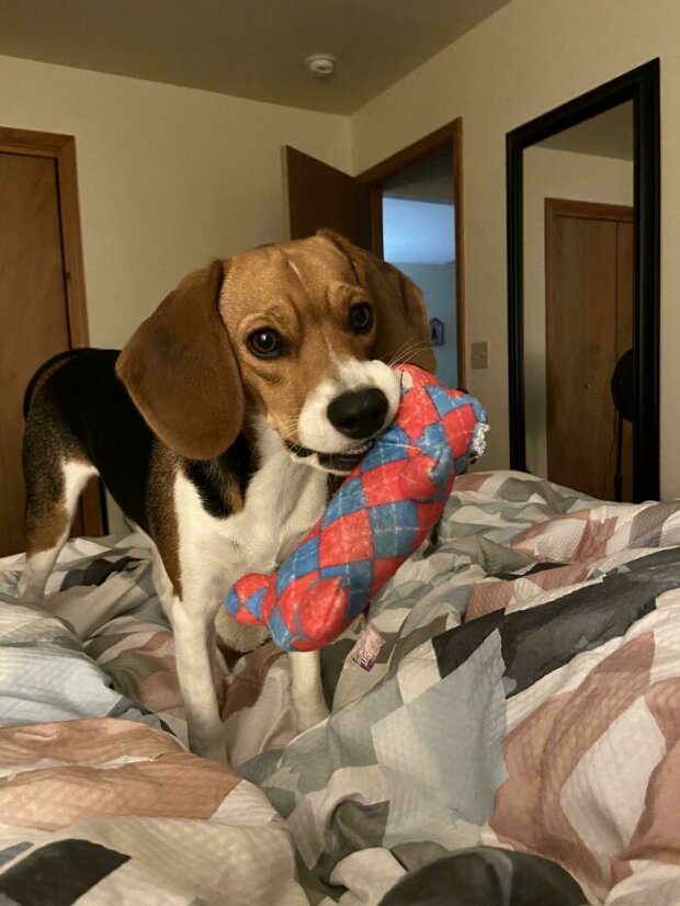Její oblíbená hračka je ta, která je pro ni příliš velká a byla určena pro mého většího psa
