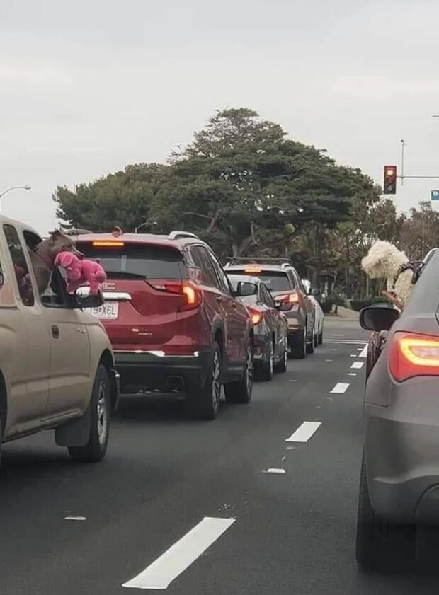 Pitbull ukazuje svou oblíbenou hračku psovi v druhém autě