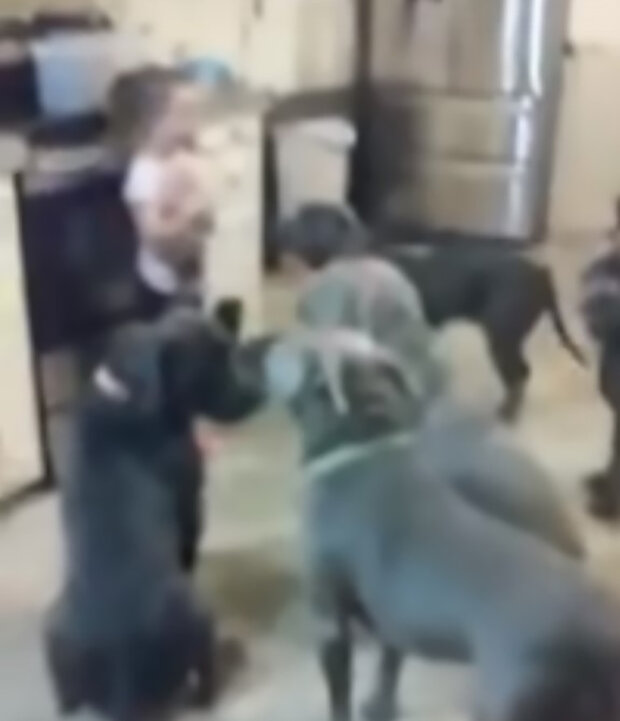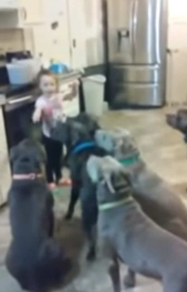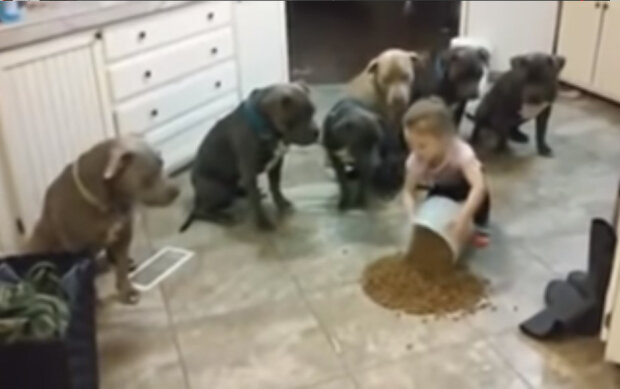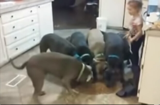 Na videu čtyřletá dívka nalévá psí jídlo na podlahu - zatímco šest obrovských pitbuliv trpělivě čeká na její pokyny. Jsou tak disciplinovaní, že se brání útočit na jídlo, i když jídlo krásně voní.