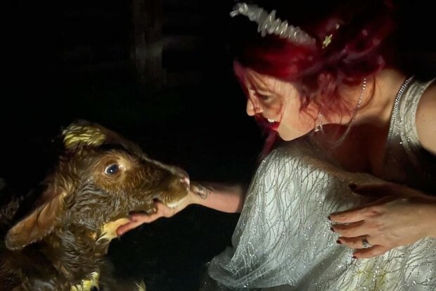 Uprostřed oslavy začala rodit kráva jménem Jacot Drama a nevěsta Jesse Lawsová musela zvířeti pomáhat přímo ve svatebních šatech.
