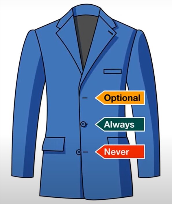 5. Aby oblek dobře seděl doporučuje se pravidlo třech knoflíků. Dolní nikdy, prostřední vždy, horní jenom občas.