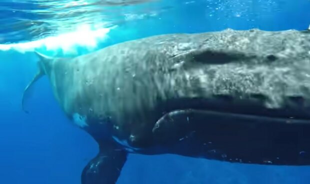 Když byla Heizer pod vodou, začala se jejím směrem pohybovat obrovská modrá velryba.