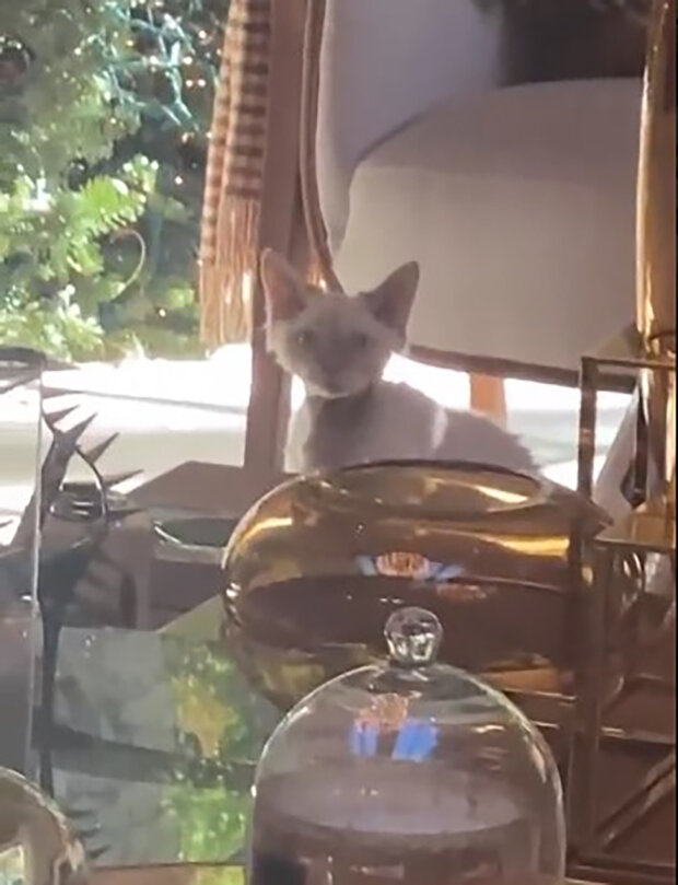 Kotě šťastně zamrzlo při pohledu na svou novou majitelku. I když je to možná jen převlek? A vlastně už spřádá plány, jak převzít stromeček, který Jennifer Lopez již zdobila do Vánoc?
