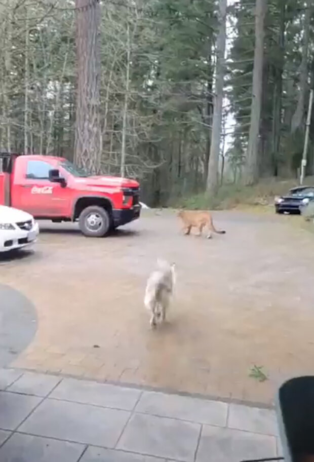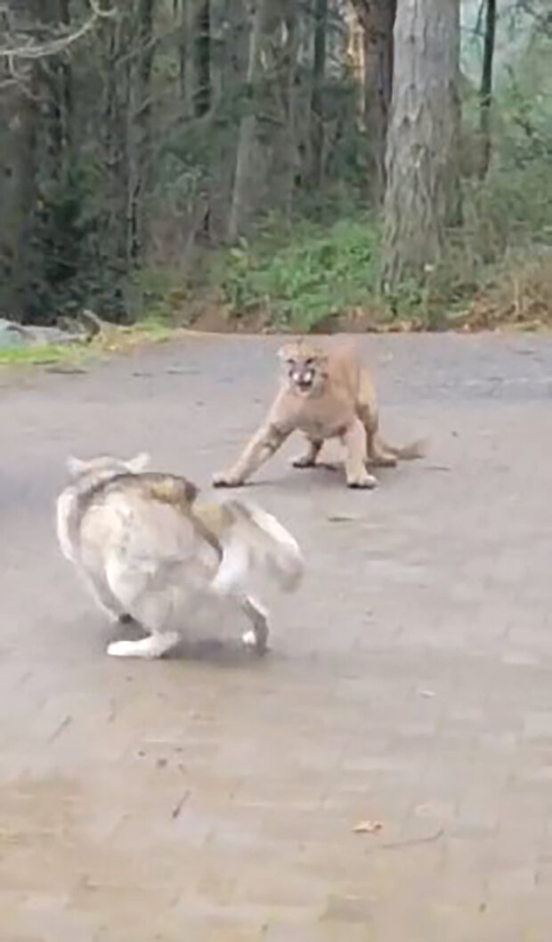 V kanadském městě Saanich na ostrově Vancouver (Britská Kolumbie) musel domácí husky pes odolat pumě, která se zatoulala na území domácího vlastnictví.