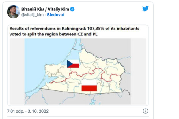 Vyvrcholením byla jako by věrohodná informace, že se v Kaliningradu konalo referendum, v němž drtivá většina obyvatel (a dokonce více než 100%) hlasovala pro připojení k České republice. Tento příspěvek sdílel účet Vitalije Kima, předsedy správy Nikolajevské oblasti Ukrajiny.