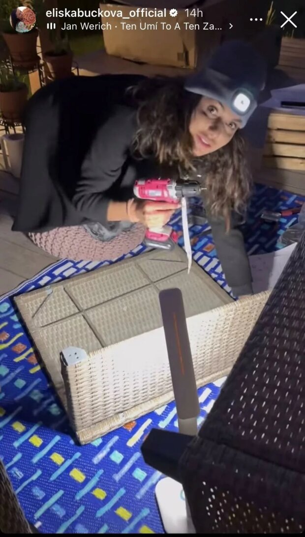 Tentokrát se rozhodla sestavit zahradní nábytek a s aku vrtačkou se pohybovala s takovou zručností, jako když používá kosmetický štětec na svůj obličej.