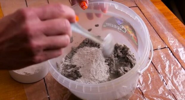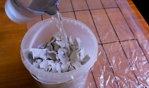 4. Když je lepenka úplně rozpuštěna, přidejte do této směsi sádru a vše důkladně promíchejte. Směs by měla být hustá s minimálním množstvím tekutiny, takže v případě potřeby přidejte více sádry.