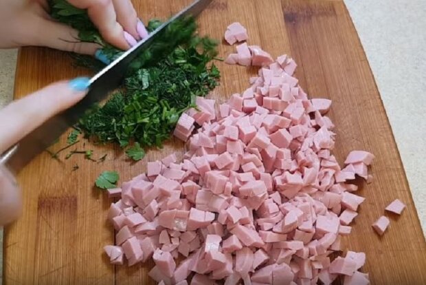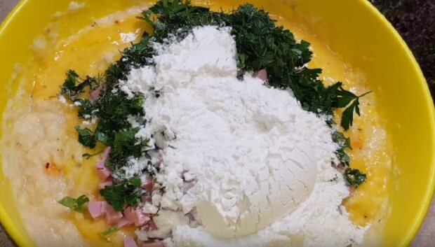 3 Do bramborového těsta přidejte vejce, na drobno nakrájené párky a nasekané bylinky. Párky můžete zaměnit kuřecím masem nebo klobásou.