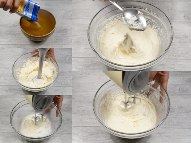 Studené tekuté želé nalijte do získané tvarohové hmoty, šlehejte při nízké rychlosti.