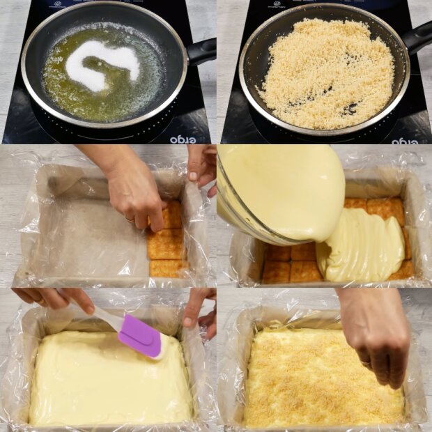 Pečicí misku zakryjte přilnavou fólií, dejte sušenky do první vrstvy a tvarovanou hmotu nahoru. Na pánvi zahřejte máslo, přidejte cukr a kokos. Smažte, při pravidelném míchání, do zlatohnědá a nechte vychladnout.