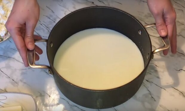 1 Tvaroh a mléko za pravidelného míchání vařte po dobu 7-10 minut. Pokud je tvaroh suchý a nízkotučný, ihned se začne tavit.
