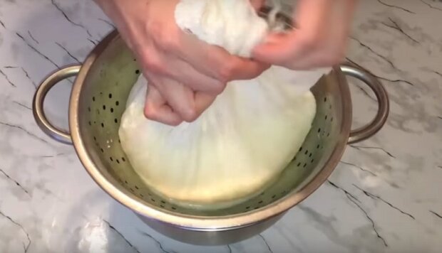 2 Hotovou hmotu dejte do cedníku a nechejte odtéci přebytečnou tekutinu. Na dotek by hmota měla připomínat měkkou táhnoucí se plastelínu.
