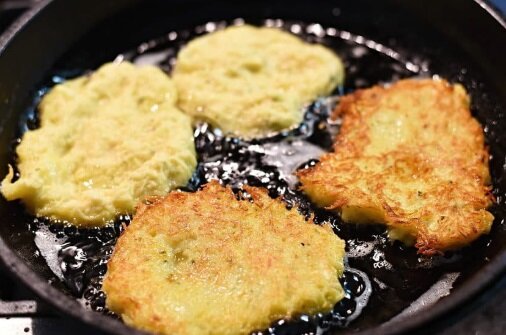 Na pánvičce rozpálíme olej (nebo sádlo). Placky smažíme z obou stran dozlatova.