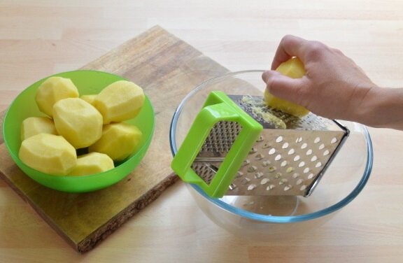 Vložíme do cedníku, abychom se zbavili přebytečné vody. Přidáme vejce, mouku a pasírovaný česnek. Následně z nádoby, nad kterou jsme přecedili brambory vylejeme šťávu, až zůstane jen škrob. Jednu lžičku škrobu přidáme společně se smetanou do nastrouhaných brambor. Směs dochutíme solí a pepřem.