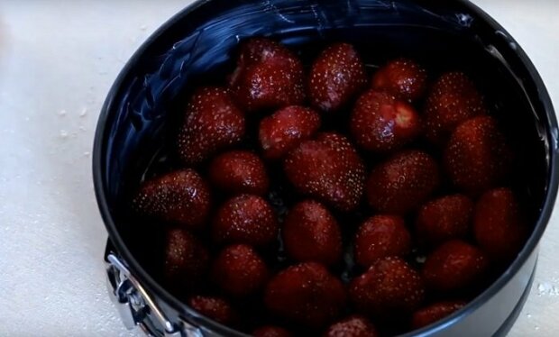 - Formu na dort naolejujte. Na do formy vykládejte umyté jahody.