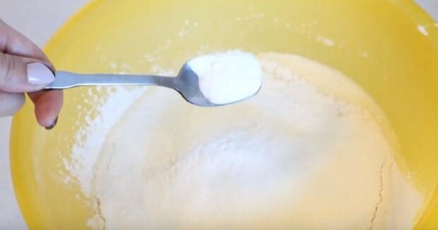 - Nalijte kefír a máslo do nádoby, promíchejte trochu a ušlehejte mixérem nastaveným na nízkou rychlost. Proste mouku, přidejte sodu.