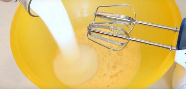 - Ušlehejte vejce se špetkou soli mixérem nastaveným na nízkou rychlost, do zvětšení objemu. Přidejte cukr do nádoby a pokračujte v šlehání po dobu 5 minut, až se vytvoří nadýchaná lehká hmota.