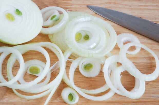 Nakrájíme cibuli na půlkruhy, je možné si vzít červenou cibuli.