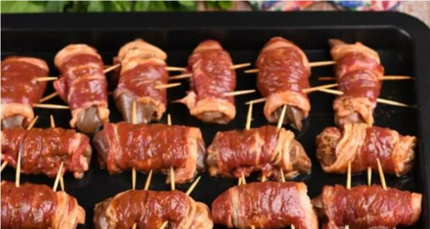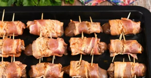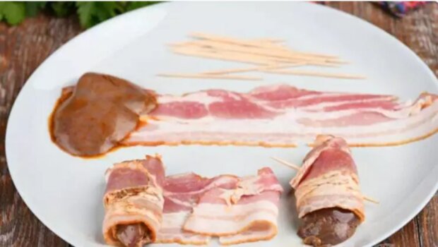 Na jeden konec slaniny dáme kousek jater a dvakrát ho zabalíme. Odřízněte zbývající slaninu. Aby se role neotočily, opravíme je párátky.