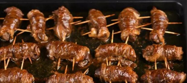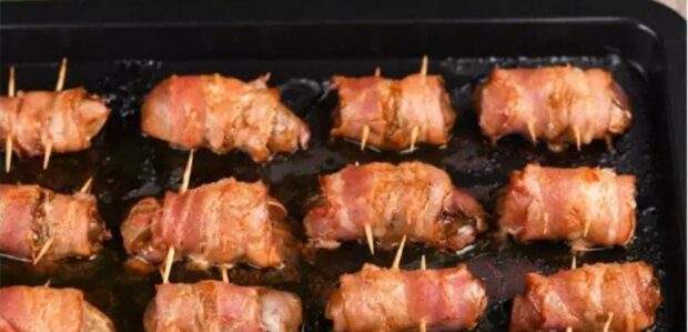 Vařte předkrm v troubě na 200-220 stupňů po dobu 15-20 minut. Pokud je slanina opečená, můžete vytáhnout.