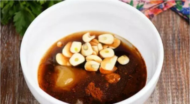 Samotná kuřecí játra jsou jemná, takže můžete použít absolutně jakoukoli marinádu podle vašich preferencí. Kombinujeme tedy sójovou omáčku, rostlinný olej, citronovou šťávu, med, papriku, pepř a česnek nakrájené na talíře do jedné misky. Obracíme pozornost k medu, ten se musí úplně rozpustit. Může být nahrazen cukrem.