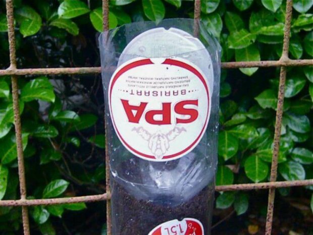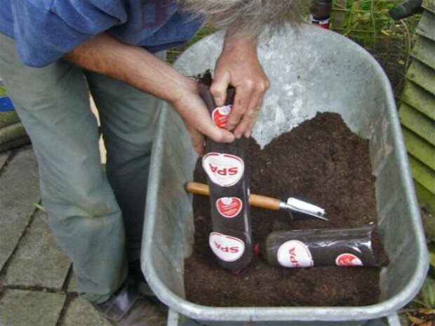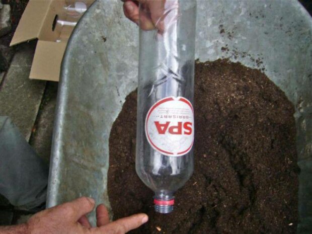 Naplňujeme láhev úrodnou půdou, která nedosahuje doslova pár centimetrů k okraji.