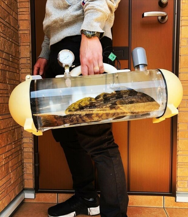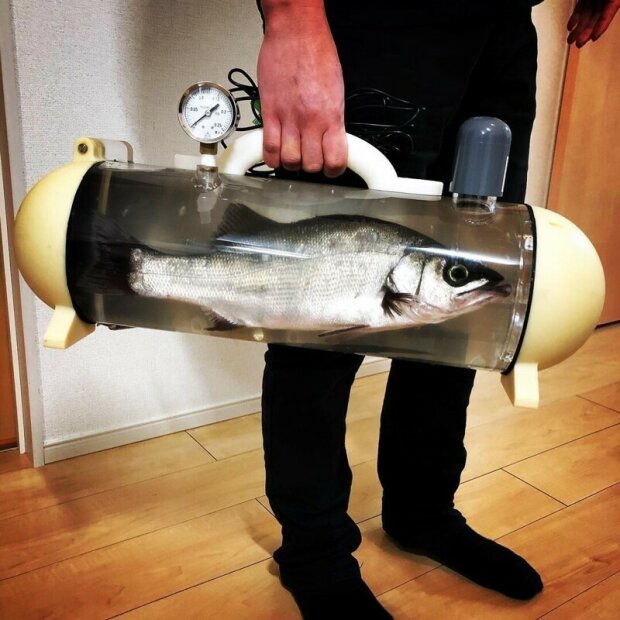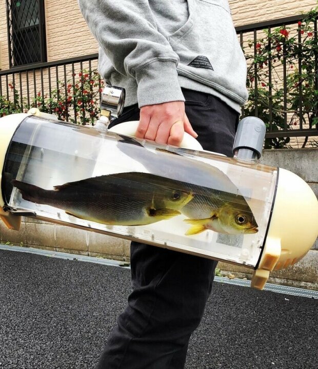 Toto přenosné akvárium, které se říká "taška katsugyo", je průhledná válcová nádoba s držadlem a senzorem, který monitoruje nasycení vody kyslíkem.