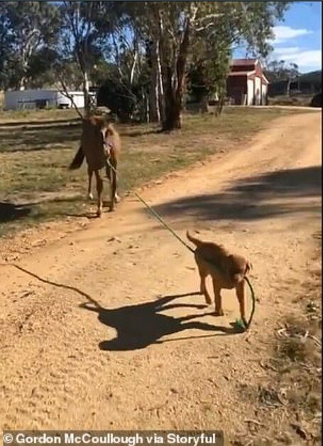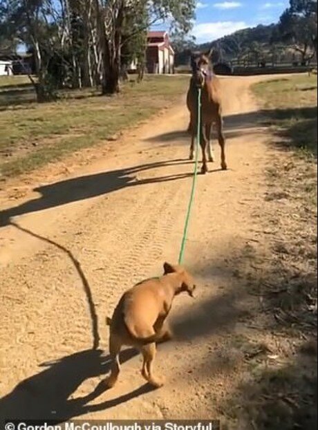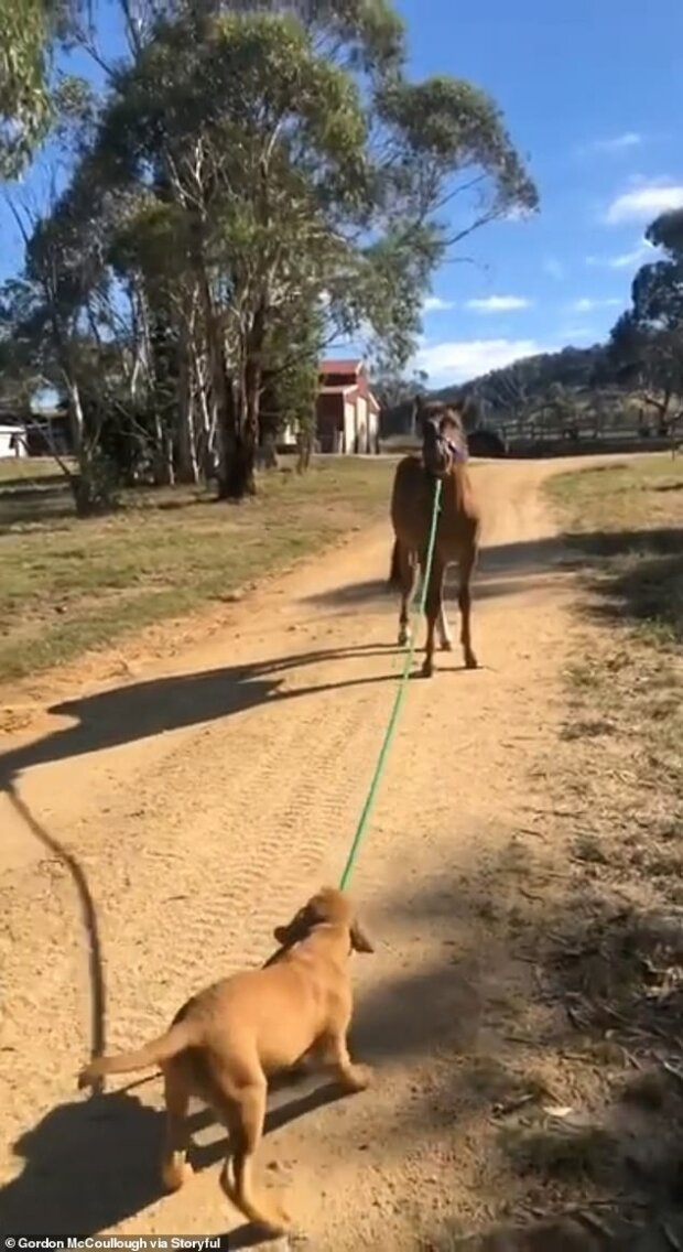 Odin vedl desetiměsíčního koně Mojo na procházku po statku a pokoušel se mladého koně táhnout za provizorní vodítko vyrobené z lana.