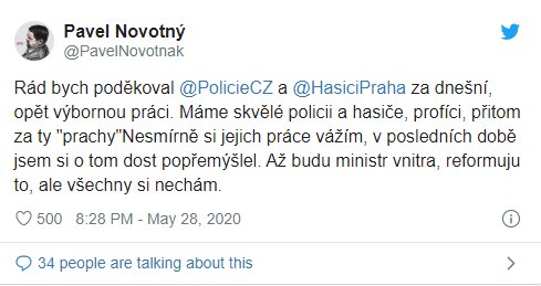 O chvíli později také přidal „Rád bych poděkoval @PolicieCZ a @HasiciPraha za dnešní, opět výbornou práci. Máme skvělou policii a hasiče, profíci, přitom za ty ‚prachy‘.