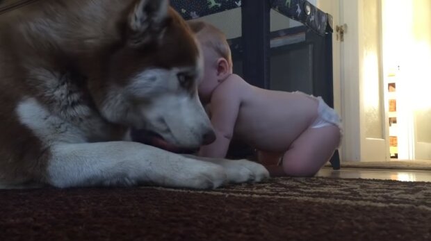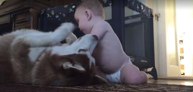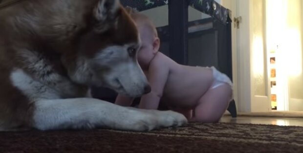 Není to tak dávno, co se v rodině tohoto husky objevil nový malý muž a projevuje o psa velký zájem.